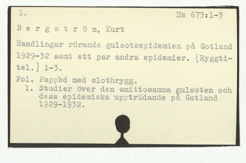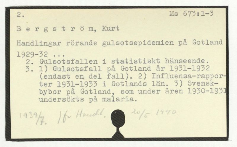 3. 1) Gulsofsfall på Gotland år 1931-1932 (endast en del av fall). 2) Influensa-rapporter 1931-1933 i Gotlands län. 3) Svensk-bybor på Gotland, som under åren 1930-1931 undersökt på malaria.