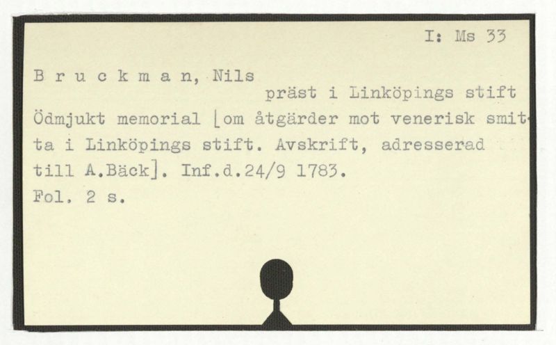 Ödmjukt memorial [om åtgärdar mot venerisk smitta i Linköpings stift. Avskrift, adresserad till A.Bäck]. Inf.d.24/9 1783.