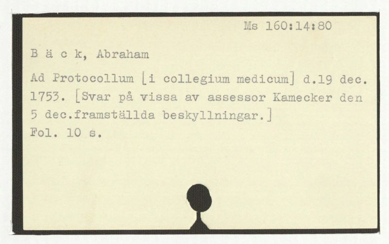 Ad Protocolllum [i collegium medicum] d.19 dec. 1753. [Svar på vissa av assessor Kamecker den 5 dec. framställda beskyllningar.]