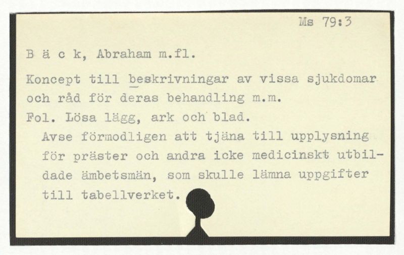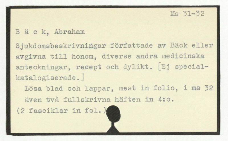 Sjukdomsbeskrivningar författade av Bäck eller avgivna till honom, diverse andra medicinska anteckningar, recept och dylikt. [Ej special-katalogiserade.]