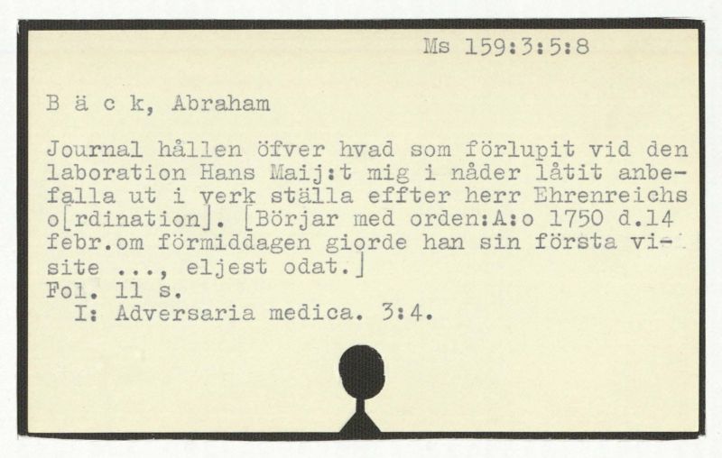 Journal hållen öfver hvad som förlupit vid den laboration Hans Maij:t mig i nåder låtit anbefalla ut i verk ställa efter herr Ehrenreichs o[rdination]. [Börjar med orden:A:o 1750 d.14 febr.om förmiddagen giordre han sin första visite ... , eljest odat.]