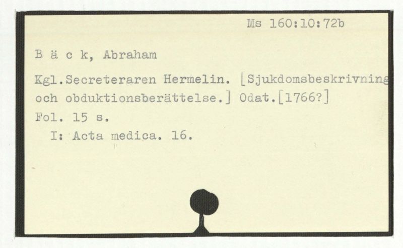 Kgl.Secreteraren Hermelin. [Sjukdomsbeskrivning och obduktionsberättelse.] Odat.[1766?]