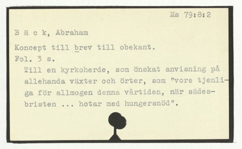 Till en kyrkoherde, som önskat anvisning på allehanda växter och örter, som "vore tjenliga för allmogen denna vårtiden, när sadesbristen ... hotar med hungersnöd'."