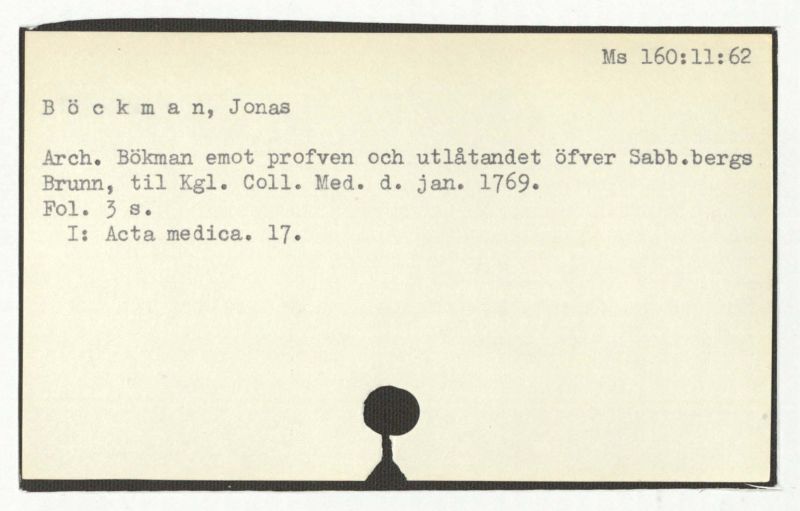 Arch. Böckman emot profven och utlåtan det öfver Sabb.bergs Brunn, till Kgl. Coll. Med. d. jan. 1769.