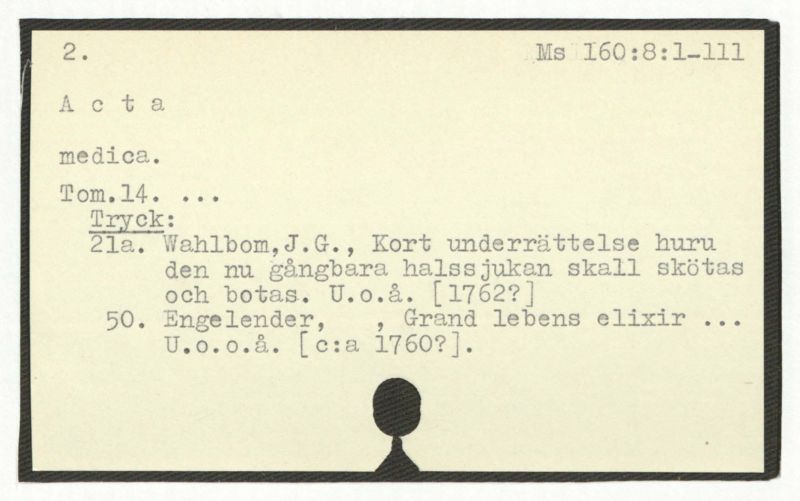 21a. Wahlbom, J.G., Kort underrättelse huru den nu gångbara halssjukan skall skötas och botas. U.o.å. [1762?]