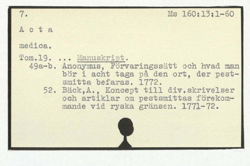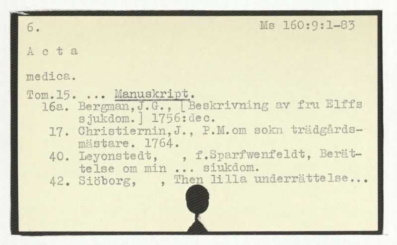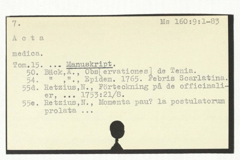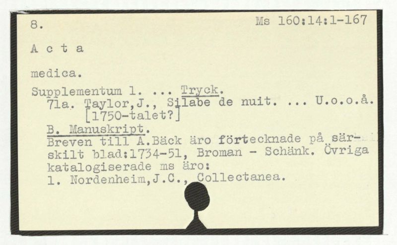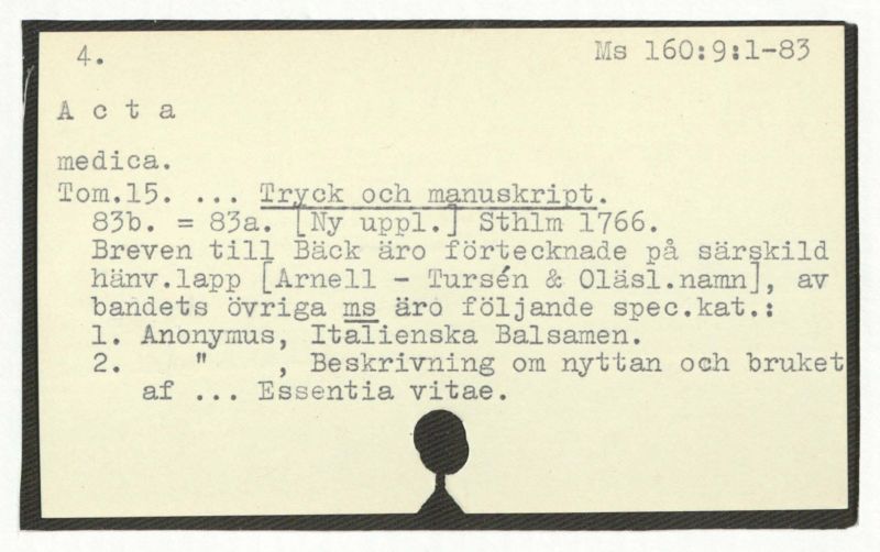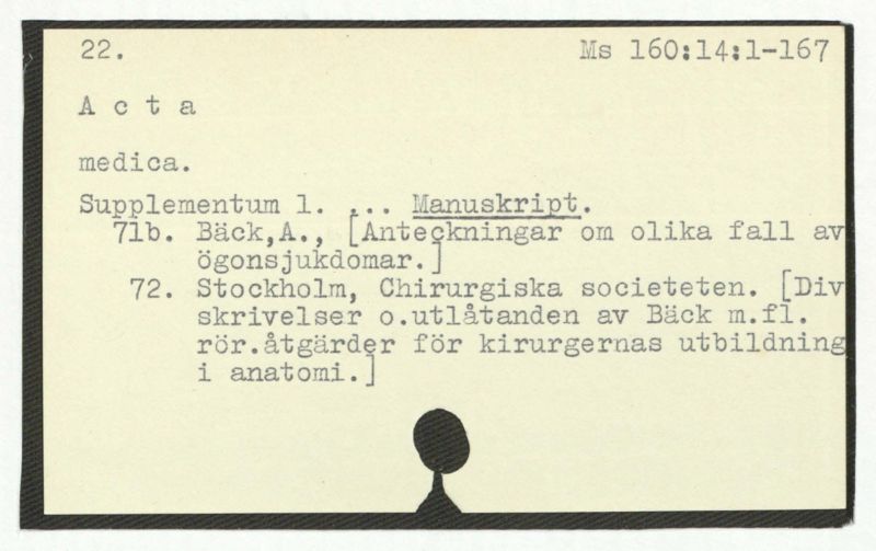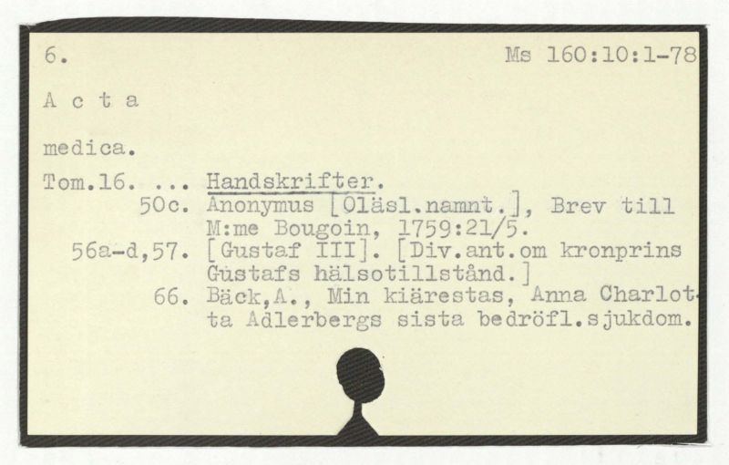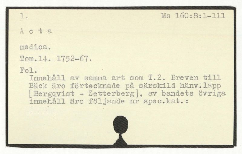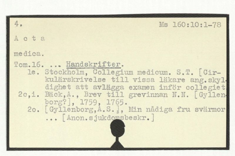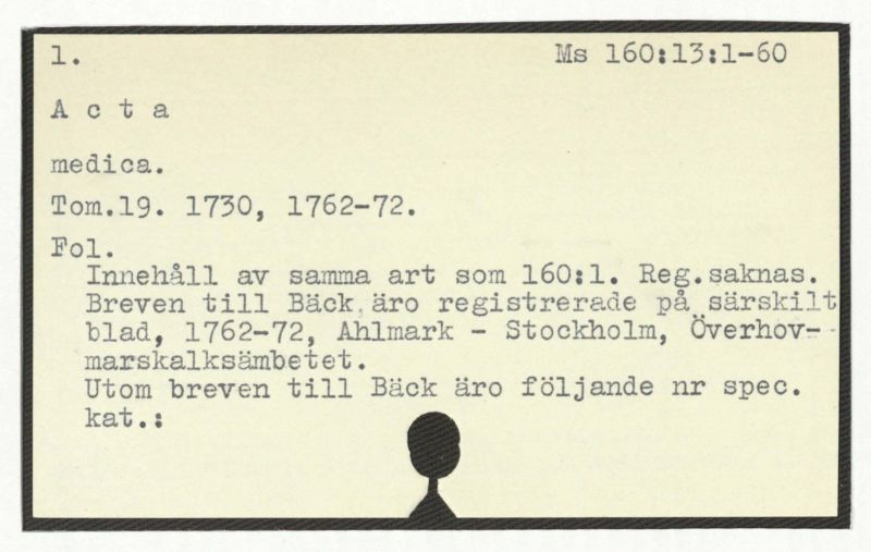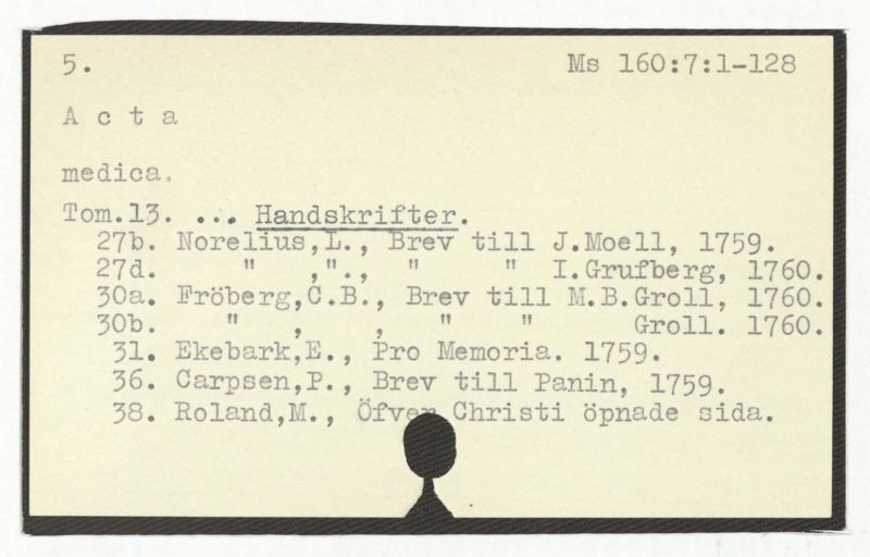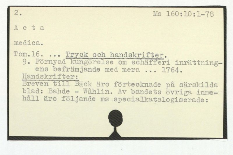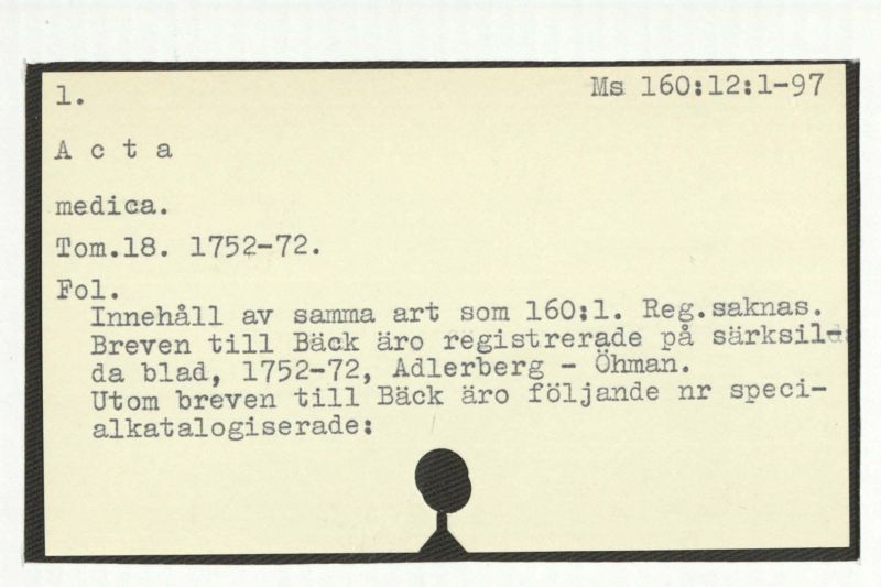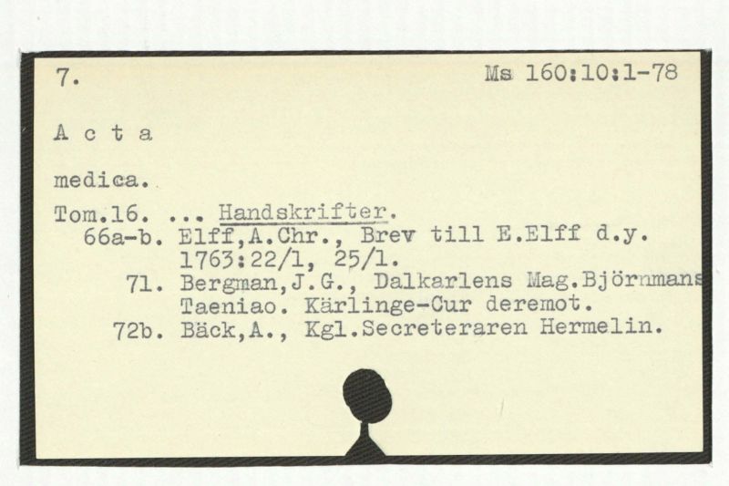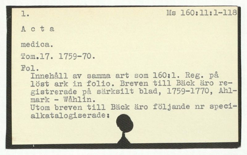 Breven till A.Bäck äro förtecknade på särskilt blad:1734-51, Broman – Schänk. Övriga katalogiserade ms äro:
