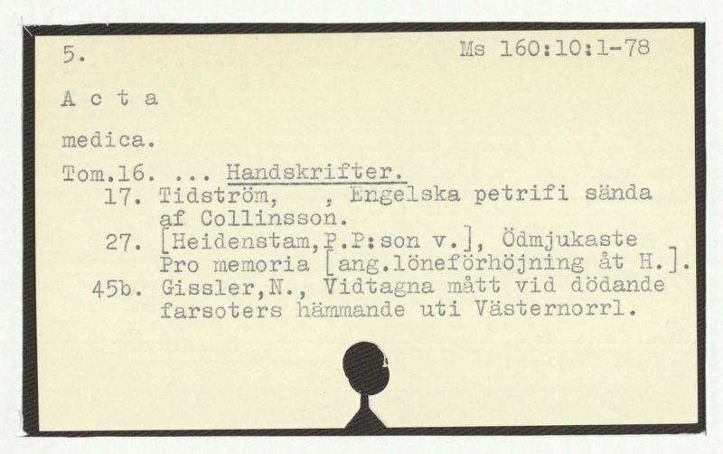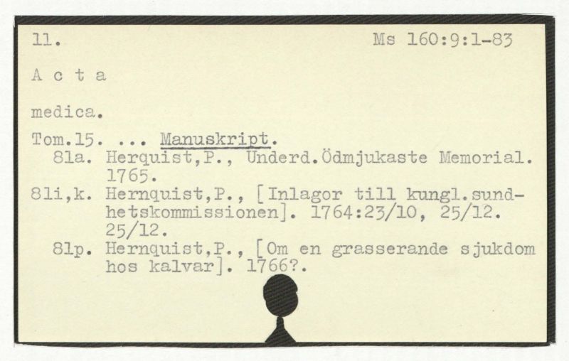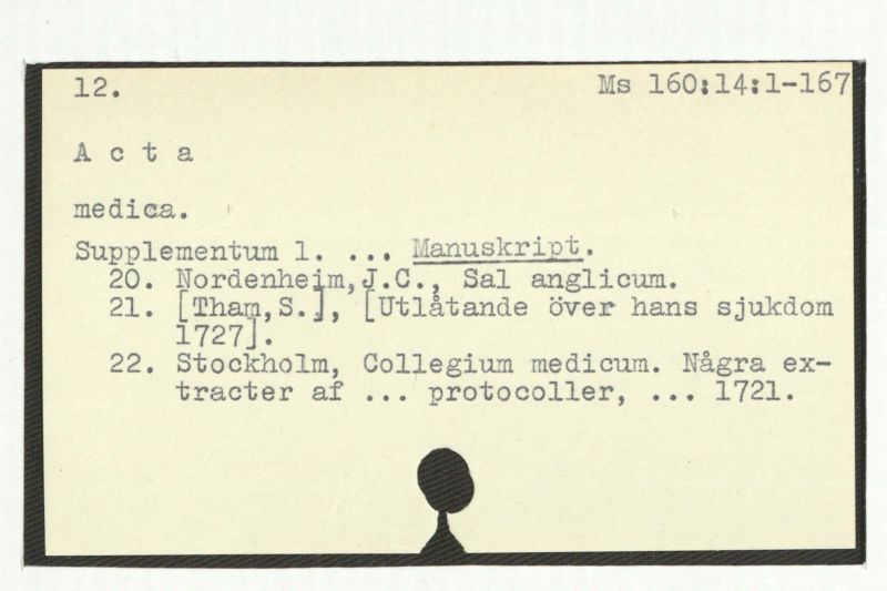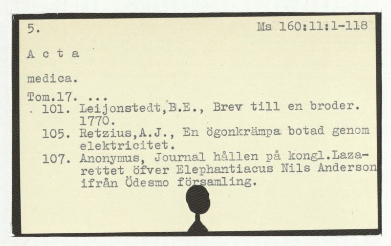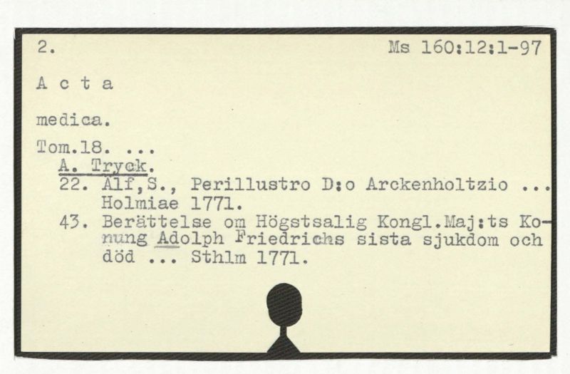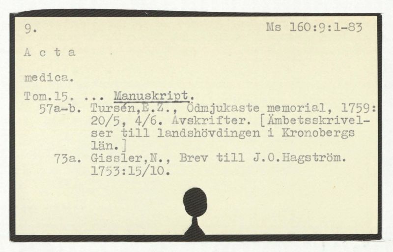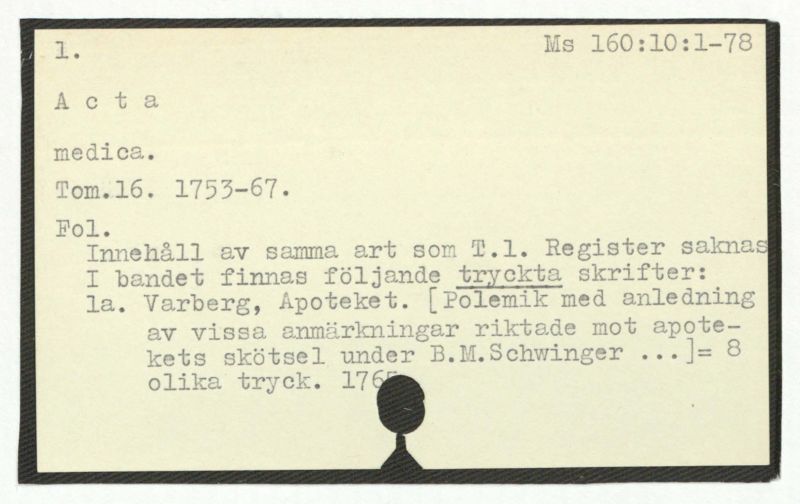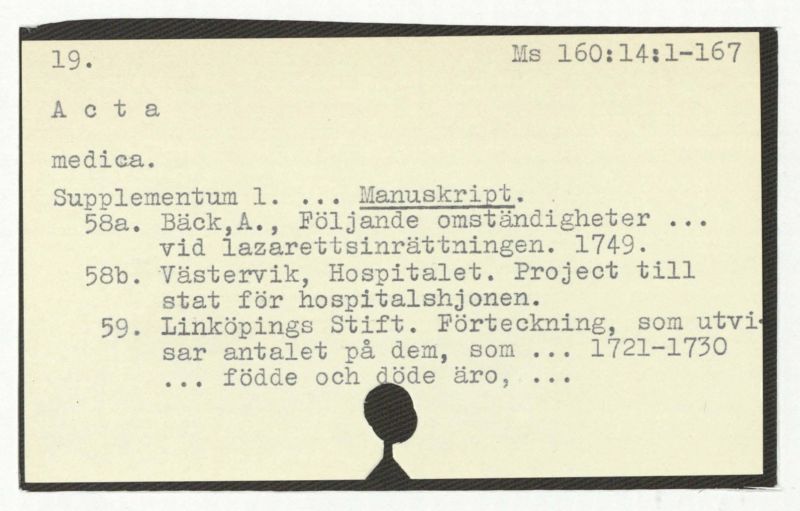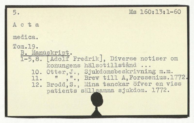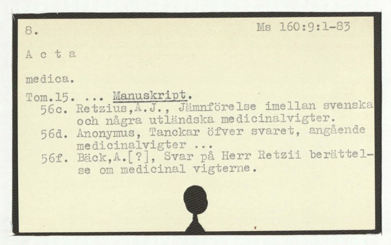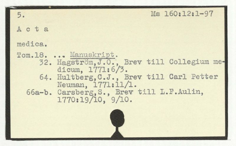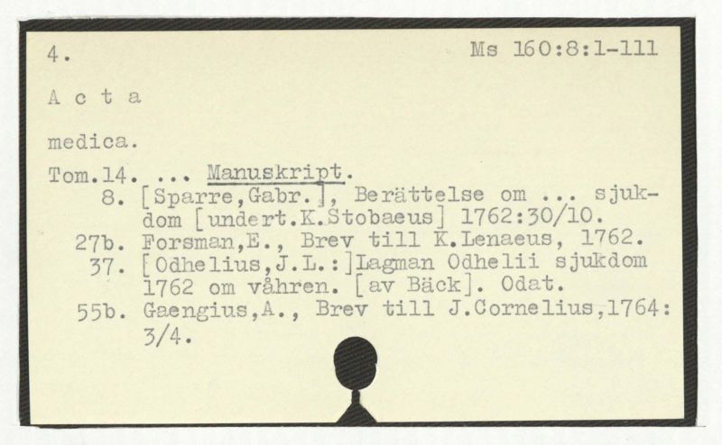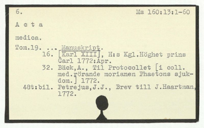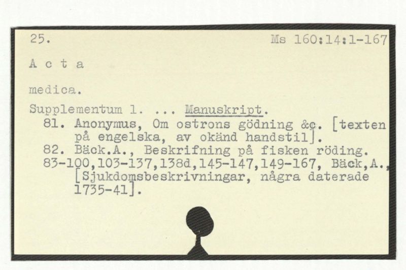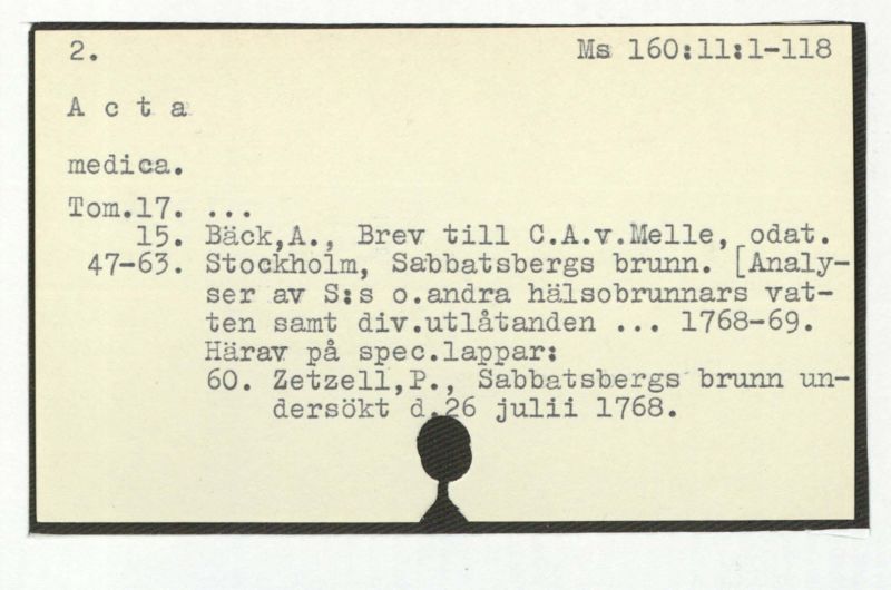 Breven till A.Bäck äro förtecknade på särskilt blad:1734-51, Broman – Schänk. Övriga katalogiserade ms äro: