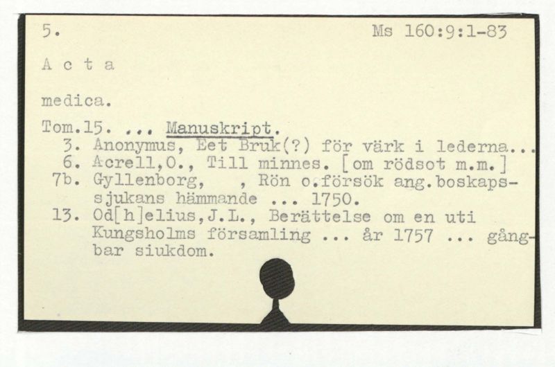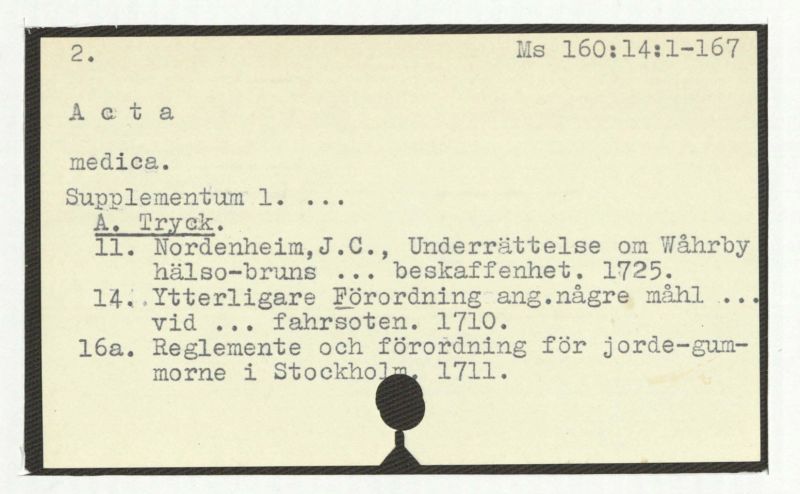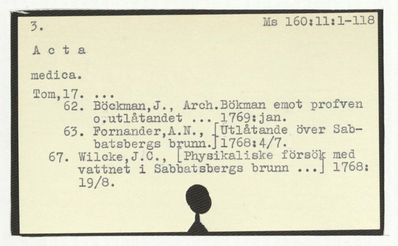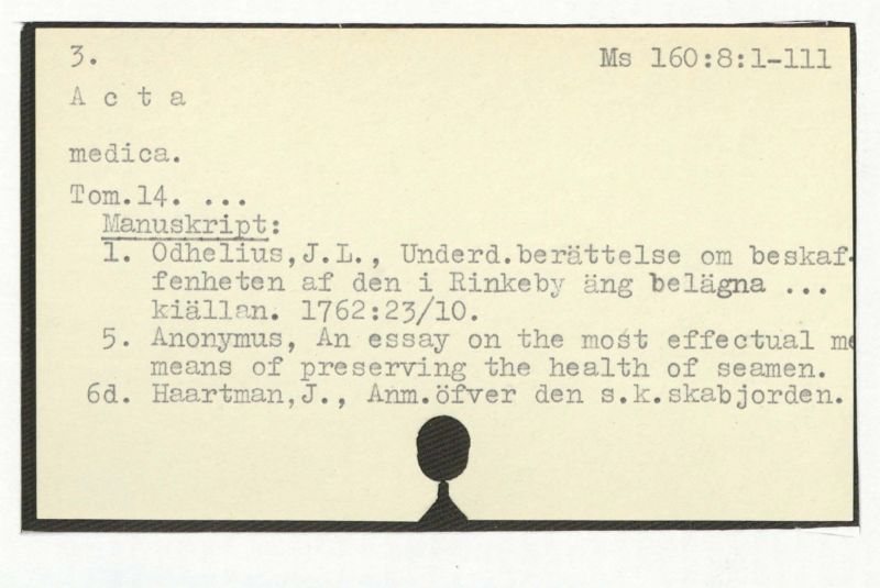 1. Odhelius, J.L., Underd.berättelse om beskaffenheten af den i Rinkeby äng belägna ... kiällan. 1762:23/10.