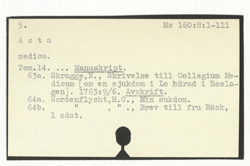 63a. Skragge,N., Skrivelse till Collegium Medicum [om en sjukdom i Lo härad i Roslagen]. 1763:9/6. Avschrift.