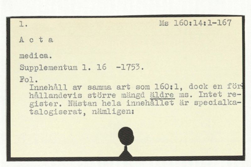 Innehåll av samma art som 160:1, dock en för hällandevis större mängd äldre ms. Intet reregister. Nästan hela innehället är specialalkatalogiserat, nämligen: