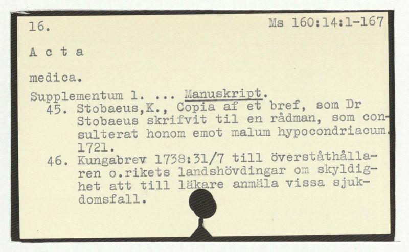 45. Stobaeus,K., Copia af et bref, som Dr Stobaeus skrifvit til en rådman, som consulerat honom emot malum hypocondriacum 1721.