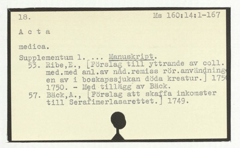 53. Ribe,E., [Förslag till yttrande av coll. med.med anl.av näd.remiss rör.avändning en av i boskapssjukan döda kreatur.] 1750 1750. – Med tillägg av Bäck.