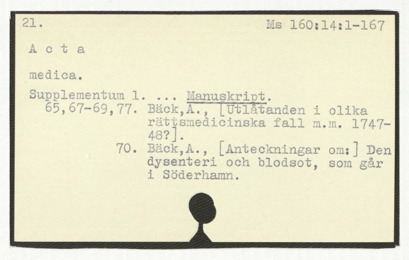 65, 67-69, 77. Bäck, A., [Utlåtanden i olika rättsmedicinska fall m.m. 1747-48?].