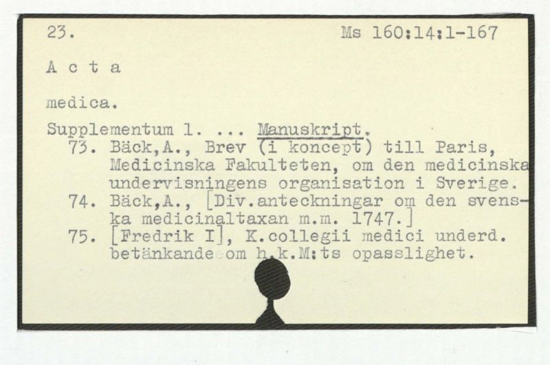74. Bäck,A., [Div. anteckningar om den svenska medicinaltaxan m.m. 1747. ]