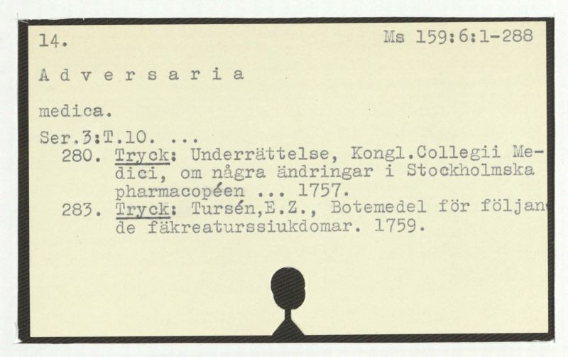 280. Tryck: Underrättelse, Kongl.Collegii Medic, om några ändringar i Stockholmska pharmacopeen ... 1757.