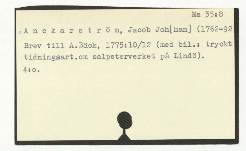 Brev till A.Bäck, 1775:10/12 (med bil.: tryckt tidningsart.om salpeterverket på Lindö).