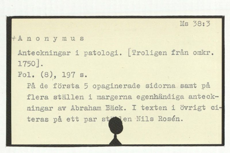 På de första 5 opaginerade sidorna samt på flera ställen i margerna egenhändiga anteckningar av Abraham Bäck. I texten i övrigt citeras på ett par ställen Nils Rosén.