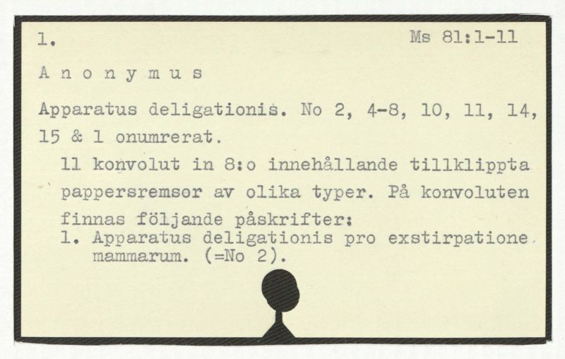11 konvolut in 8:o innehållande tillklipta pappersremser av olika typer. På konvoluten finnas följande påskrifter: