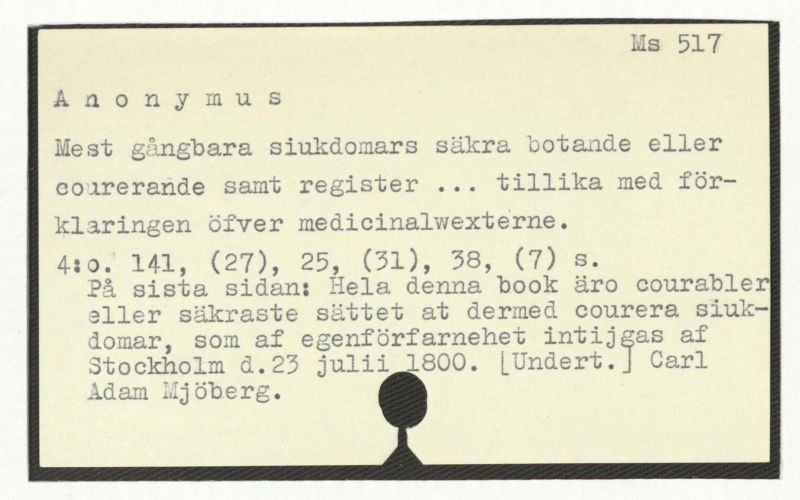 På sista sidan: Hela denna book åro courabler eller säkraste sättet at dermed courera siukdomar, som af egenförfarnehet intiiggas af Stockholm d.23 juli 1800. [Undert.] Carl Adam Mjöberg.