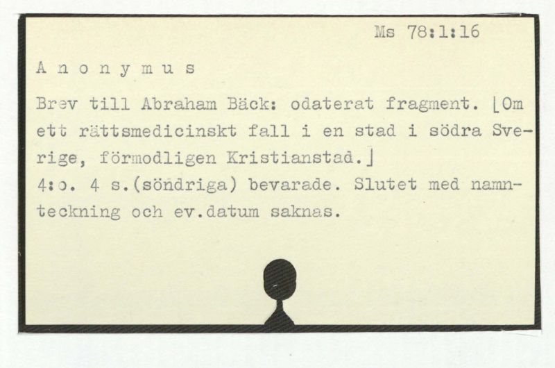 Brev till Abraham Bäck: odaterat fragment. [Om ett rättsmedicinskt fall i en stad i södra Sverige, förmodligen Kristianstad.]