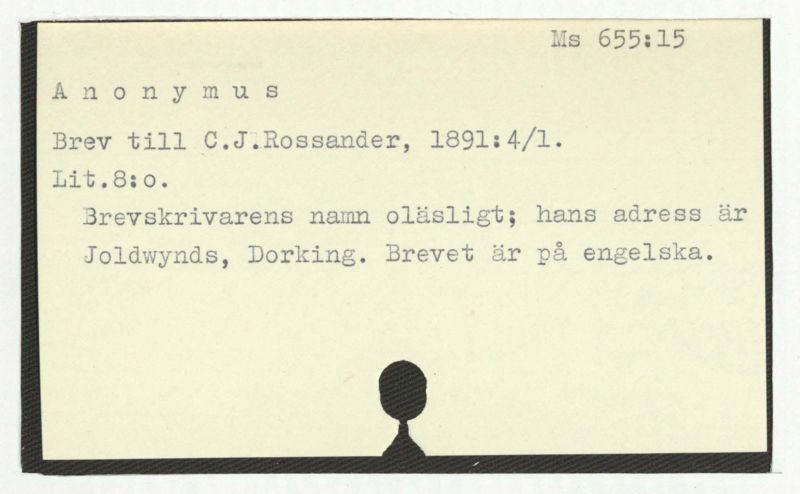 Brevskrivarens namn oläsligt; hans adress är Joldwynds, Dorking. Brevet är på engelska.