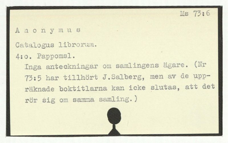 Inga anteckningar om samlingens ägare. (Nr 73:5 har tillhört J. Salberg, men av de uppräknade boktitlarna kan icke slutas, att det rör sig om samma samling.)