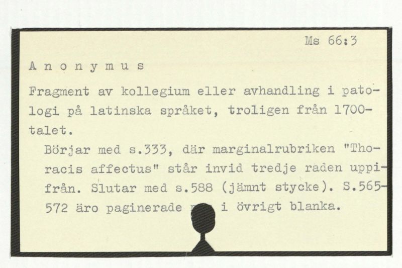 Börjar med s.333, där marginalrubriken "Thoroughcias affectus" står invind tredje raden uppi-från. Slutar med s.588 (jämmt stycke). S.565-572 äro paginerade i övrigt blanka.