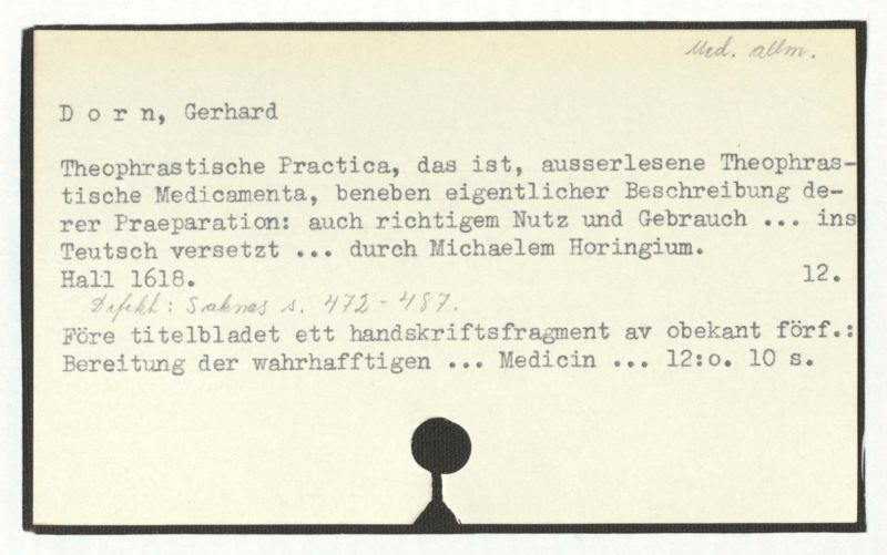 Före titelbladet ett handskriftsfragment av obekant förf.: Bereitung der wahrhaftigen ... Medicin ... 12:0. 10 s.