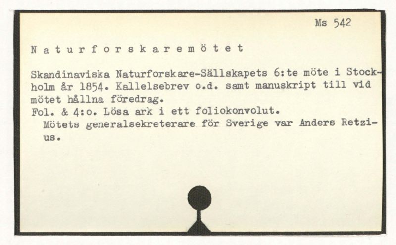 Skandinaviska Naturforskare-Sällskapets 6:e möte i Stockholm år 1854. Kallesebrev o.d. samt manuskript till vid mötet hållna föredrag.