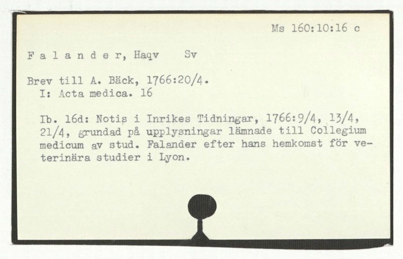 Ib. 16d: Notis i Inrikes Tidningar, 1766:9/4, 13/4, 21/4, grundad på upplysningar lämnade till Collegium medicum av stud. Falander efter hans hemkomst för veterinära studier i Lyon.