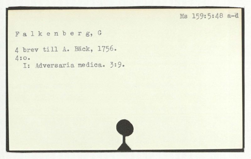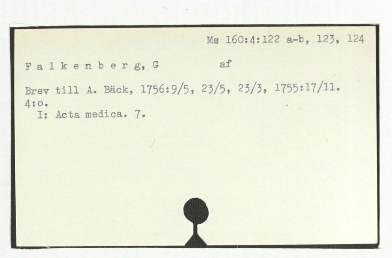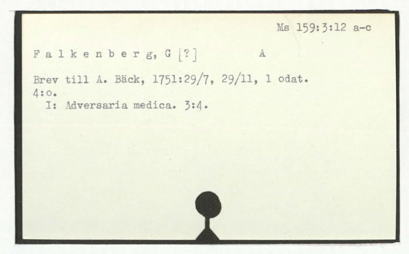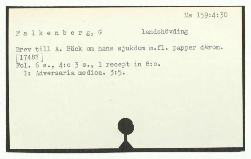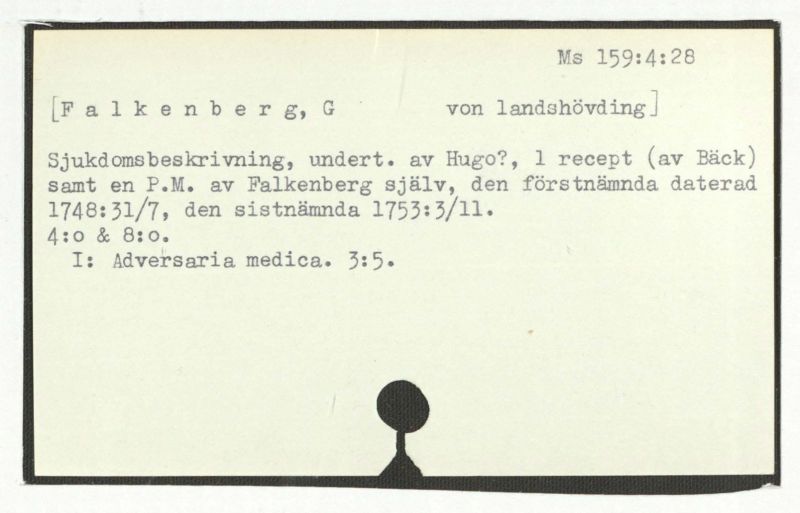 Sjukdomsbeskrivning, undert. av Hugo?, 1 recept (av Bäck) samt en P.M. av Falkenberg själv, den förstnämnda daterad 1748:31/7, den sistnämnda 1753:3/11.
