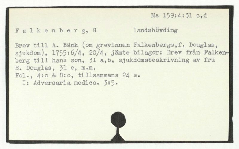 Brev till A. Bäck (om grevinman Falkenbergs,f. Douglas, sjukdom), 1755:6/4, 20/4, jämte bilagor: Brev från Falkenberg till hans son, 31 a,b, sjukdomsbeskrivning av fru B. Douglas, 31 e, m.m.