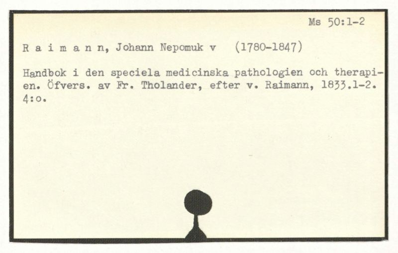 Handbok i den speciela medicinska pathologien och therapien. Öfvers. av Fr. Tholander, efter v. Raimann, 1833.l-2. 4:0.