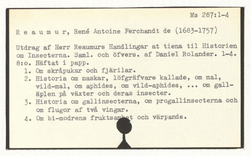 Utdrag af Herr Reaumurs Handlingar at tiena til Historien om Insecterna. Saml. och öfvers. af Daniel Rolander. 1-4. 8:o. Häftat i papp.