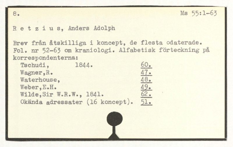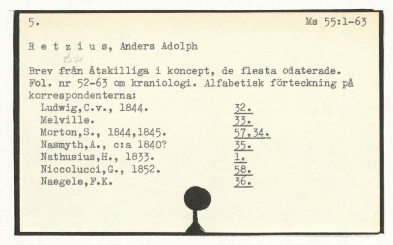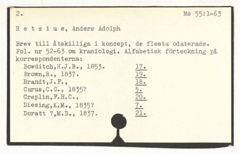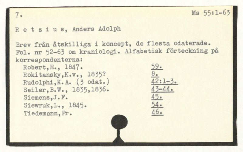 Fol. nr 52-63 om kranioologi. Alfabetisk förteckning på korrespondenterna: