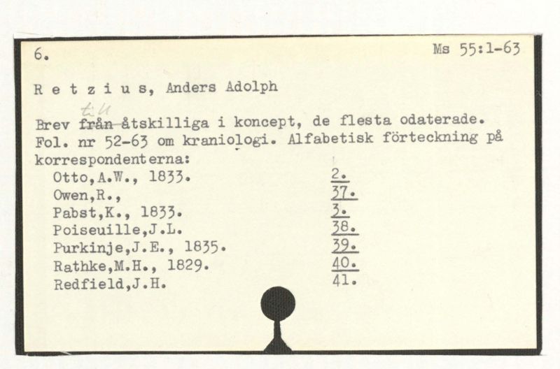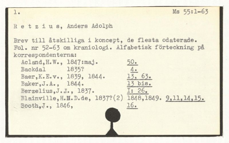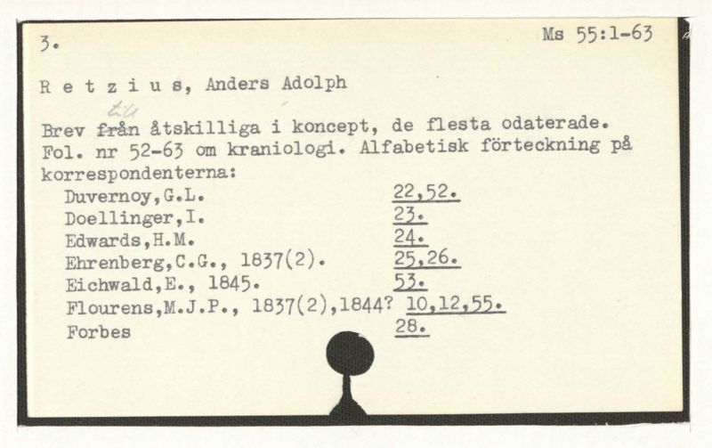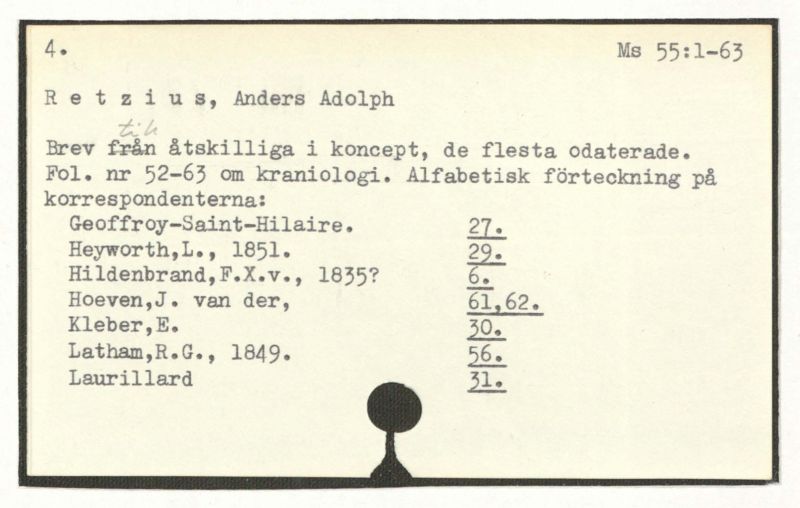 Fol. nr 52-63 om kraniologi. Alfabetisk förteckning på korrespondenterna: