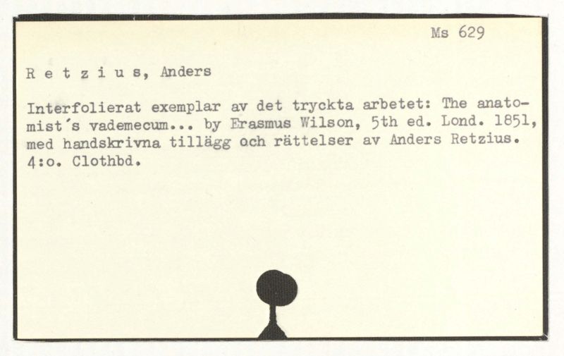 Interfolierat exemplar av det tryckta arbetet: The anatomistic’s vademecum... by Erasmus Wilson, 5th ed. Lond. 1851, med handskrivna tillägg och rättelser av Anders Retzius. 4:o. Clothbhd.