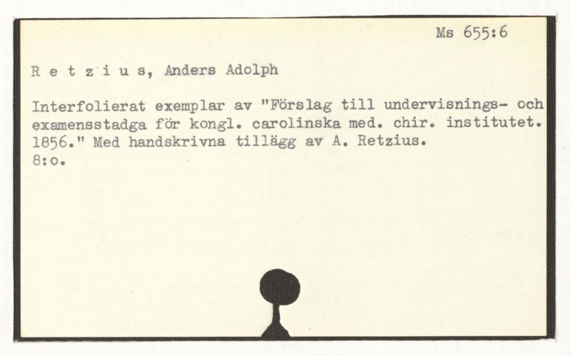 Interfolierat exemplar av "Förslag till undervisningsoch examensstadga för kongl. carolinska med. chir. institutet. 1856." Med handskrivna tillägg av A. Retzius. 8:o.