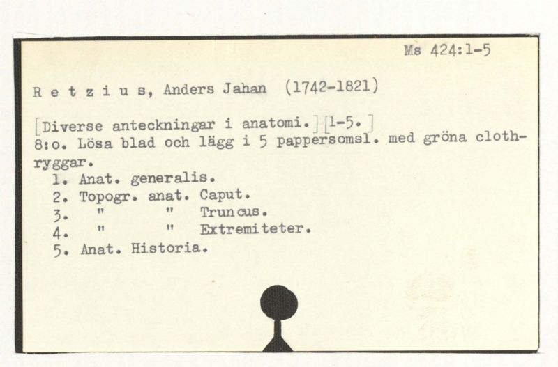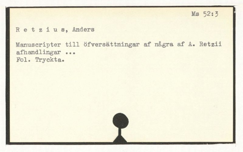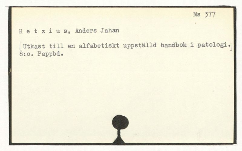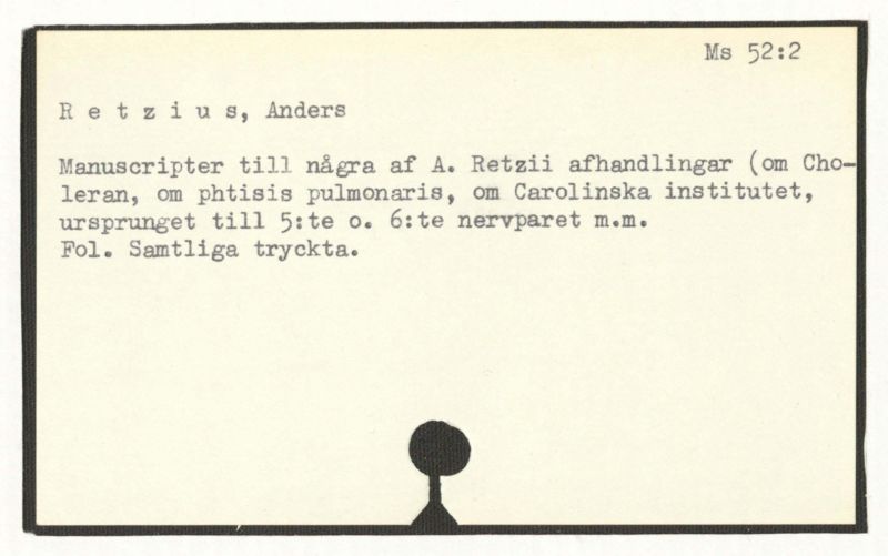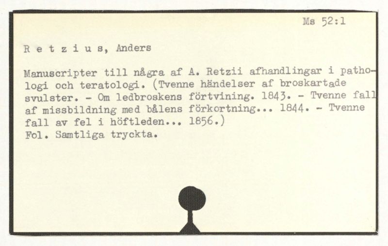 Manuscripter till några af A. Retzii afhandlingar i pathologi och teratologi. (Tvenne händelser af broskartade svulster. – Om ledbroksen för tvining. 1843. – Tvenne fall av missbildning med bålens förkortning... 1844. – Tvenne fall av fel i höftleden... 1856.) Fol. Samtliga tryckta.