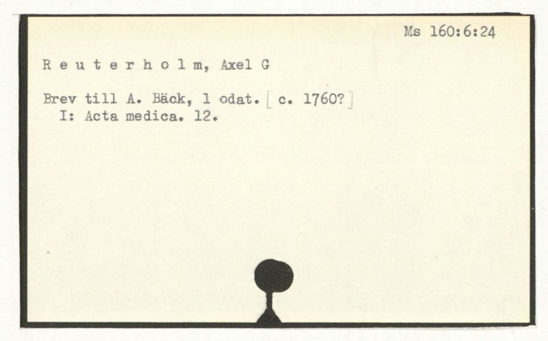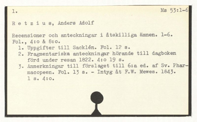 3. Ammerkningar till förslaget till 6:a ed. af Sv. Pharmacopeen. Fol. 13 s. – Intyg åt F.W. Mewes. 1843. 1 s. 4:0.