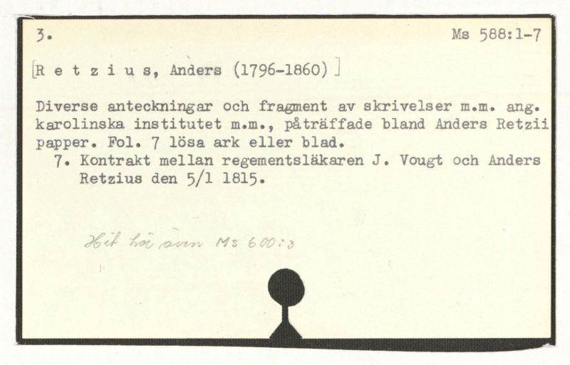 Diverse anteckningar och fragment av skrivelser m.m. ang. karolinska institutet m.m., påträffade bland Anders Retzii papper. Fol. 7 lösa ark eller blad.