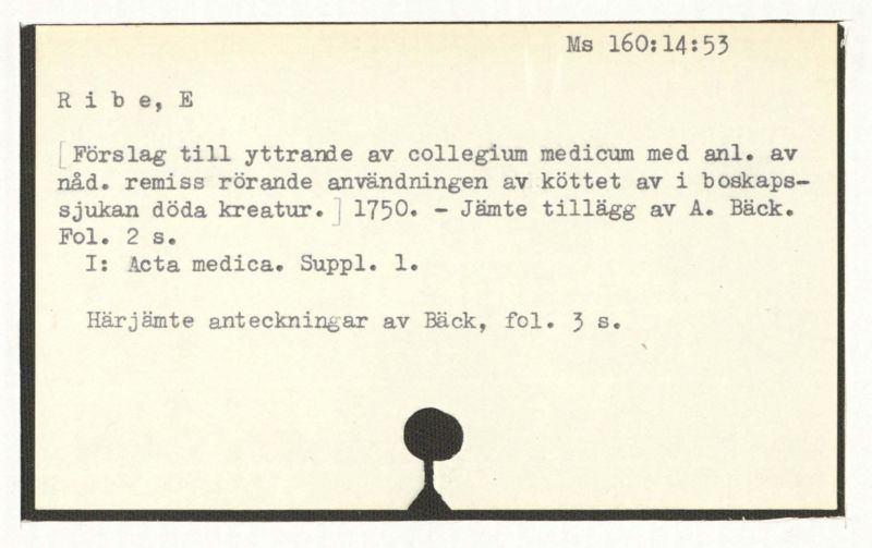 [Förslag till yttrande av collegium medicum med anl. av nåd. remiss rörande användningen av köttet av i boskapssjuan döda kreatur.] 1750. – Jämte tillägg av A. Bäck. Fol. 2 s.
