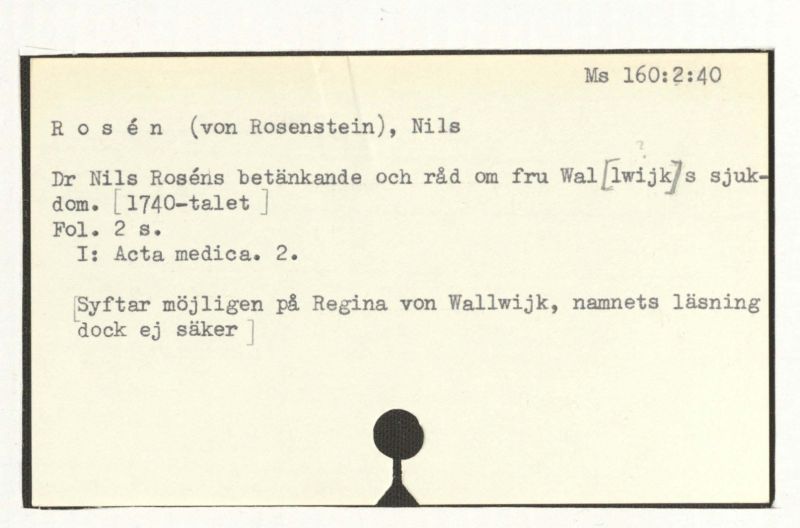 Dr Nils Rosén betänkande och råd om fru Wal[łwijk]s sjukdom. [1740-talet]