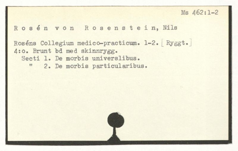 4:o. Bd med skrygg med tit.: "Roséns föreläsning i pathologien, Lib. prim." [Motsvarande "Lib.second."]