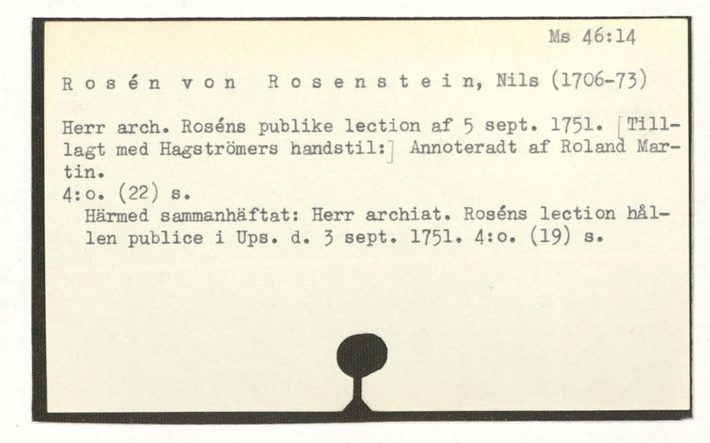 Herr arch. Rosén's publique lection af 5 sept. 1751. [Tilllagt med Hagströmers handstil:] Annoterad af Roland Martin.