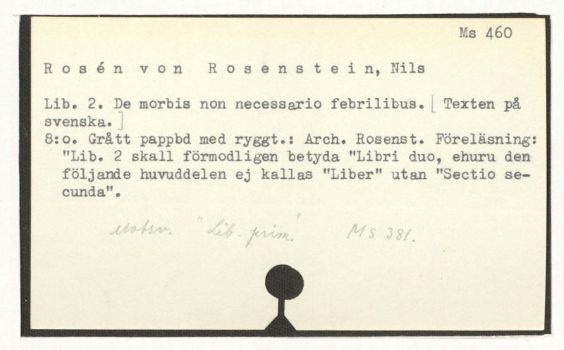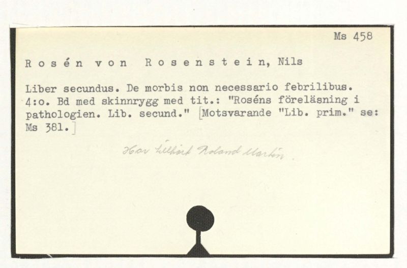4:o. Bd med skinnygg med tit.: "Roséns föreläsnings i pathologien. Lib. secund." [Motsvarande "Lib. prim." se: Ms 381.]