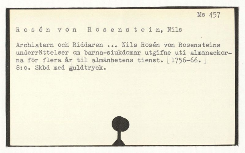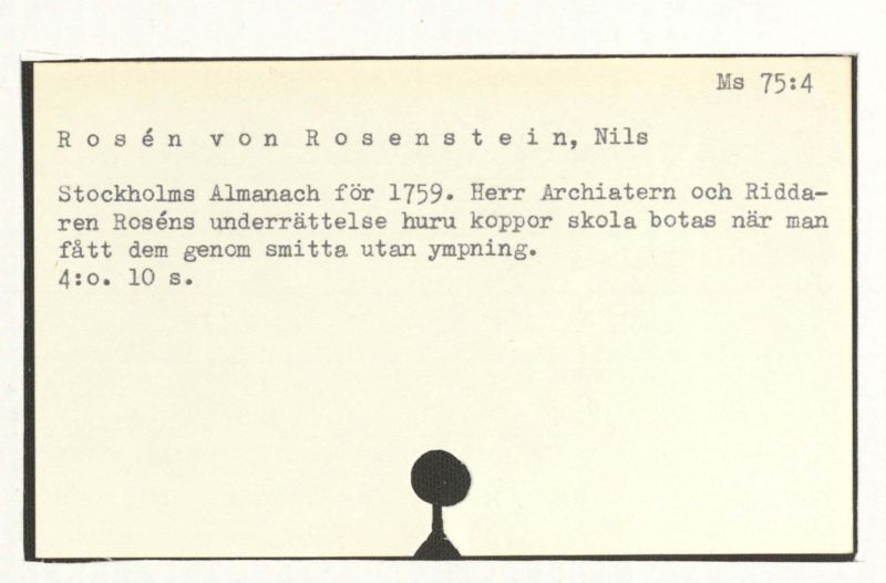 Stockholms Almanach för 1759. Herr Archiatern och Riddaren Roséns underrättelse huru koppor skola botas när man fått dem genom smitta utan ympning.