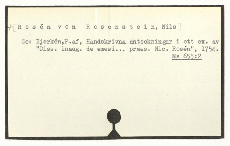 Se: Bjerkén,P.af, Handskrivna anteckningar i ett ex. av "Diss. inaug. de emesi... praes. Nic. Rosén", 1754.