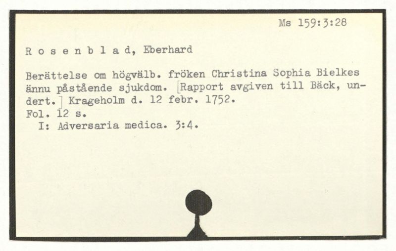 Berättelse om högvälb. fröken Christina Sophia Bieles ännu påstående sjukdom. [Rapport avgiven till Bäck, undert. ] Krageholm d. 12 febr. 1752.