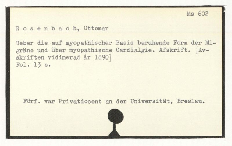 Über die auf myopathischer Basis beruhende Form der Migräne und über myopathische Cardialgie. Afskrift. [Avskriften vidimerad år 1890]